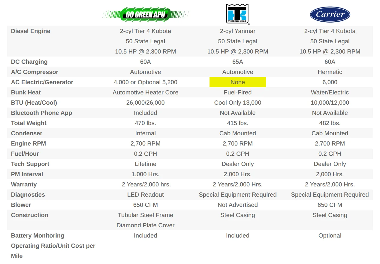 The Go Green APU (Auxiliary Power Unit) is robustly engineered to operate in the most extreme climatic conditions and withstand the rigorous demands of over-the-road trucking.